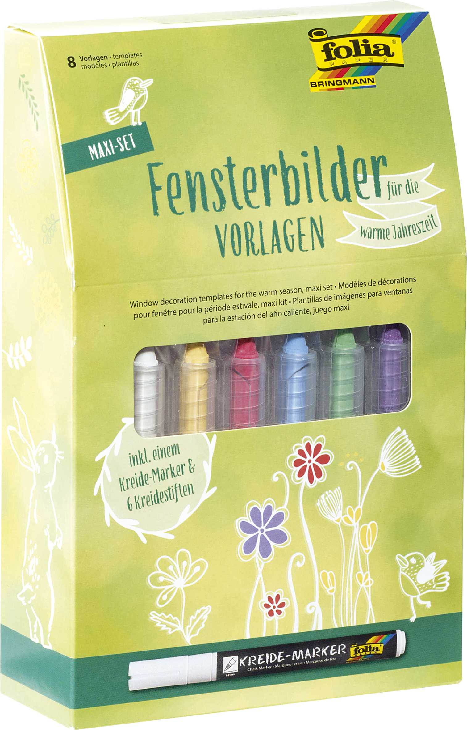 Set obsahuje 8 predlôh v skutočnej veľkosti a jednu tekutú kriedu v bielej farbe + 6 ks farebných kried v ceruzke. Motívy sú v jarnej, veľkonočnej a letnej tematike. Vytvorte si na okná veľmi peknú dekoráciu. Predlohu priložíte (prilepíte z vonkajšej strany) a pomocou tekutej kriedy obtiahnete, vyfarbíte motív podľa predlohy. Ak napr. vyfarbuje list tak pomocou špajdle, špáradlá, zmrzlinového drievka vytvoríte malé detaily.