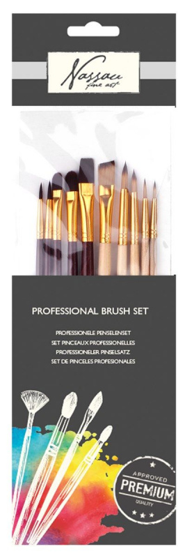 Profesionálne maliarske štetce rôznych veľkostí - 5 ks plochých a 5 ks okrúhlych štetcov. Veľkosť balenia 35 x 11 x 1 cm. Značka Nassau