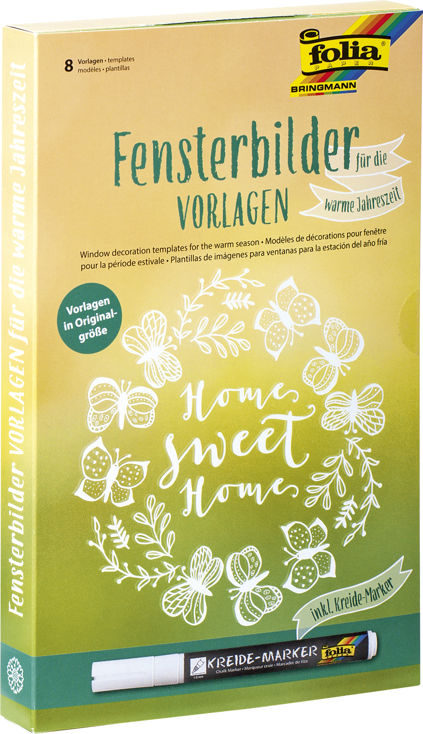 Set obsahuje 8 predlôh v skutočnej veľkosti a jednu tekutú kriedu v bielej farbe. Motívy sú v jarnej, veľkonočnej a letnej tematike. Vytvorte si na okná veľmi peknú dekoráciu. Predlohu priložíte (prilepíte z vonkajšej strany) a pomocou tekutej kriedy obtiahnete, vyfarbíte motív podľa predlohy. Ak napr. vyfarbuje list tak pomocou špajdle, špáradlá, zmrzlinového drievka vytvoríte malé detaily.