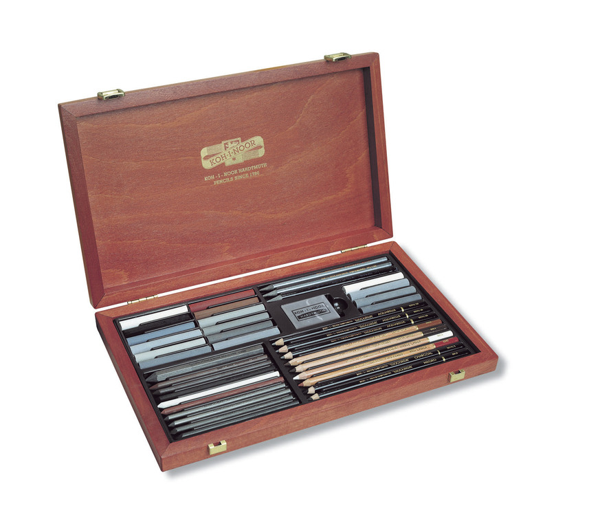 Súprava obsahuje rôzne umelecké ceruzy, tuhy a kriedy vysokej kvality v drevenej kazete: