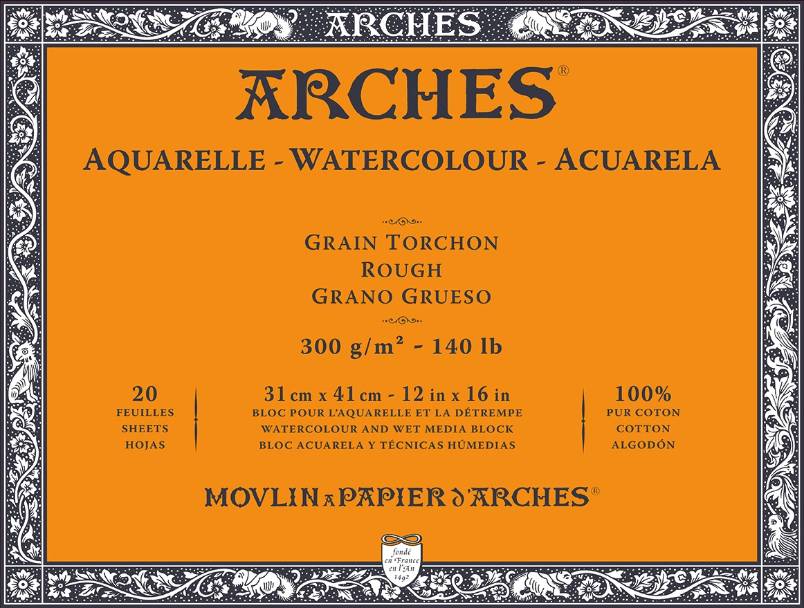 - Akvarelový papier zo 100% bavlny, ARCHES Aquarelle 300g/m2, drsný, 20 listov, 31x41cm